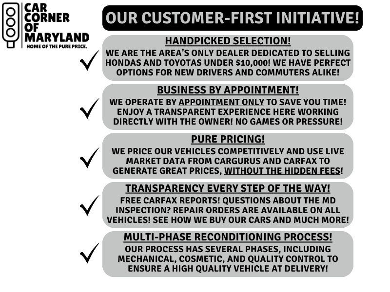 Welcome to Car Corner of Maryland, the area’s leading dealership for Pre Owned Hondas and Toyotas under $10,000! Offering the most reliable cars at great prices, we have helped countless families find vehicles for their new drivers, and commuters looking for a reliable car that won’t break the bank!