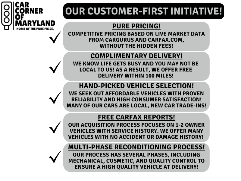 Tired of the hidden fees? We are too! Here at Car Corner of Maryland, we believe in a transparent buying experience from start to finish, and pride ourselves on our honest pricing model. Our hand-picked inventory of vehicles under $15,000 grants our customers access to proven and reliable vehicles that won't break the bank! Each vehicle undergoes a multi-phase inspection process, and is MD Inspected before sale. All vehicles come with a dealer warranty! Price does not include taxes, tags, registration and the Maryland Processing Fee of $799. The online price is reflective of bringing your own financing or cash! We operate by appointment to ensure vehicle and staff availability, and have FREE DELIVERY within 100 miles!