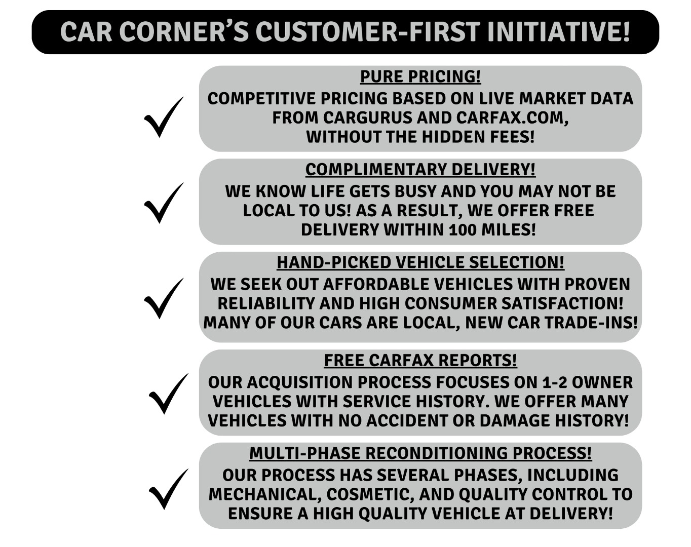 Tired of the hidden fees? We are too! Here at Car Corner of Maryland, we believe in a transparent buying experience from start to finish, and pride ourselves on our honest pricing model. Our hand-picked inventory of vehicles under $15,000 grants our customers access to proven and reliable vehicles that won't break the bank! Each vehicle undergoes a multi-phase inspection process, and is MD Inspected before sale. All vehicles come with a dealer warranty! Price does not include taxes, tags, registration and the Maryland Processing Fee of $799. The online price is reflective of bringing your own financing or cash! We operate by appointment to ensure vehicle and staff availability, and have FREE DELIVERY within 100 miles!